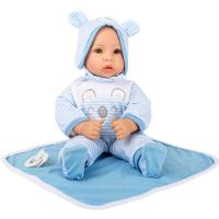 Lucas-dukken er perfekt for å klemme! Med sine glødende øyne og pålimte øyevipper vil han umiddelbart sjarmere alle dukkeforeldre. De stripete babyklærne er enkle å ta av og på, og settet kompletteres med en søt smekke med borrelås, en matchende lue med små ører, en smokk og et mykt teppe.