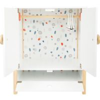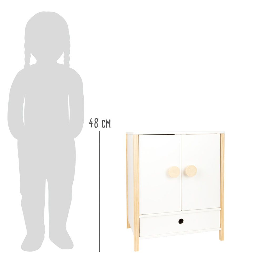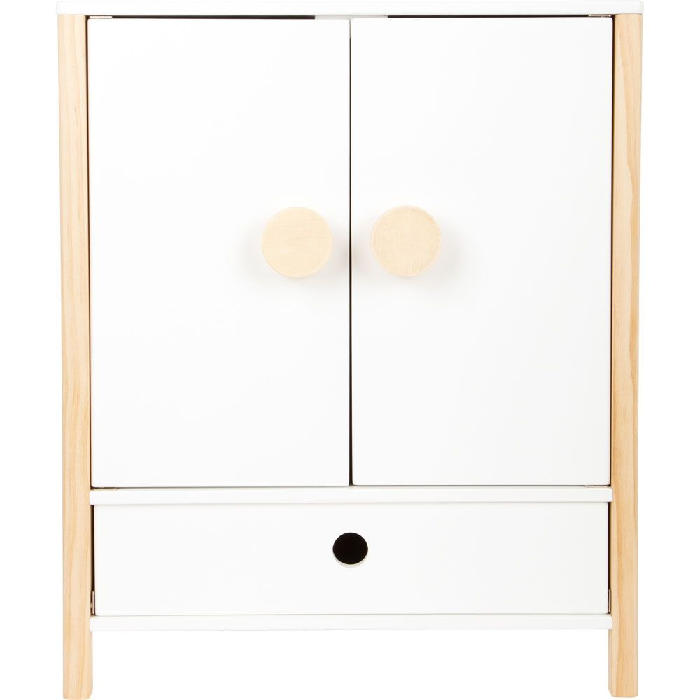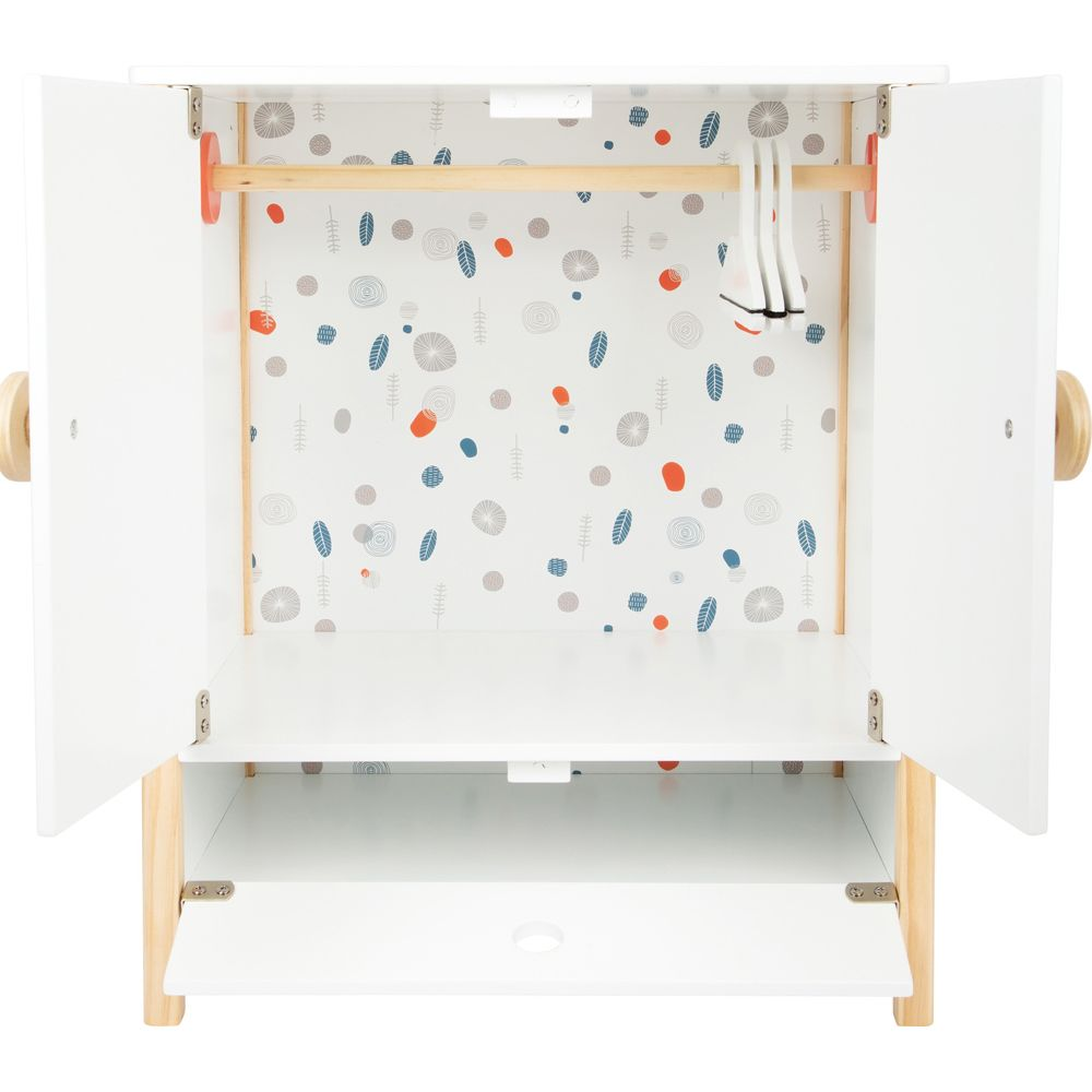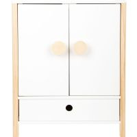 Denne vakre tregarderoben er perfekt for å holde styr på dukkeklærne dine! Med doble dører, klesstang, hyller og skuff er det god plass til alle antrekkene dine. De smarte kleshengerne med strikk gjør det enkelt å henge opp selv de minste delene. En elegant og praktisk løsning for dukker som elsker orden!
