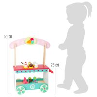 Ding-a-ling! Isbilen er her! 12 forskjellige typer iskrem på pinner eller i vafler kan presenteres med denne iskremvognen laget av tre. Med håndtakene og fire trehjul kan vognen komfortabelt skyves til neste kunde. De mange forskjellige istypene tiltrekker seg kunder og kan kombineres individuelt. Et kreativt spill for å fremme sosiale ferdigheter.