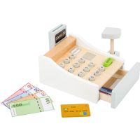 Pengene strømmer inn! Denne vakre kassen hører hjemme i enhver velorganisert leketøysbutikk for barn. Å leke med denne leken trener et barn i å håndtere penger og forstå priser. De medfølgende lekepengene og trekredittkortene passer i den uttrekkbare kasseskuffen. Prisen på kjøpte varer kan til og med tastes inn på tastaturet. Hvem er nestemann i køen?