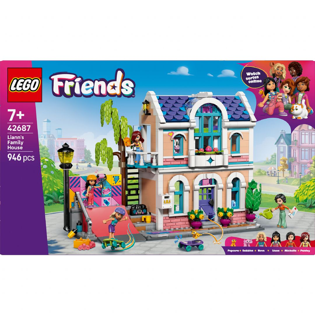 Velkommen til Lianns familiehus (42687), hvor barn fra 7 år og oppover kan lage sine egne historier. Jenter og gutter kan utforske det vakre LEGO-lekehuset med kjøkken, stue, soverom, balkong og hage. Prøv forskjellige hobbyaktiviteter mens Liann og vennene hennes skater, lager kunst og tar vare på kjæledyrene deres – en gekko og en axolotl.