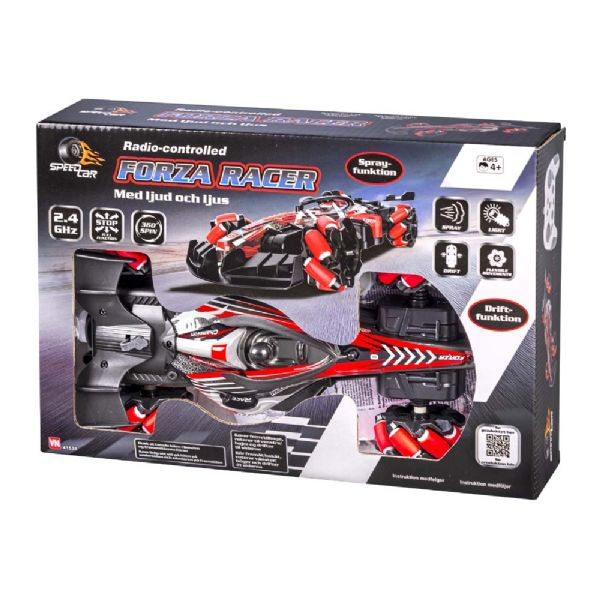 Med lys i frontlyktene. Bruker 6 stk. AA batterier.