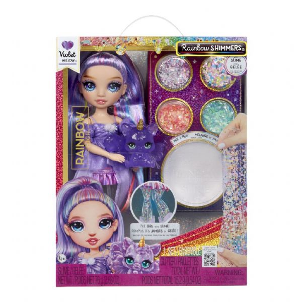 Rainbow High Rainbow Shimmers-settet kommer med et slimsett som lar deg mikse og matche dine egne glitrende farger, teksturer og former. Bruk slimet til å lage en unik regnbueeffekt på dukkens ben og forvandle utseendet hennes med vakre, skimrende fargetoner.